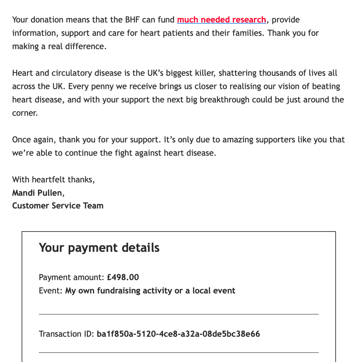 “Thank you so much for raising funds to help the British Heart Foundation continue its work.